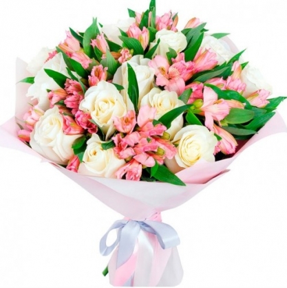 Красивый букет из роз и альстроиерии, в роскошной упаковке